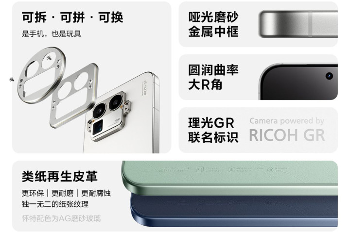 这次站C位的产品是真我GT8 Pro。其实这款手机在发布之前已经被曝光了,只不过不同场景下曝光的产品造型完全不一样,引起了不少人的关注。随后真我官宣手机与理光联名,打造了一个能打电话的“理光GR”,让手机相机联名品牌喜加一。这就成了产品最引人关注的两个卖点。