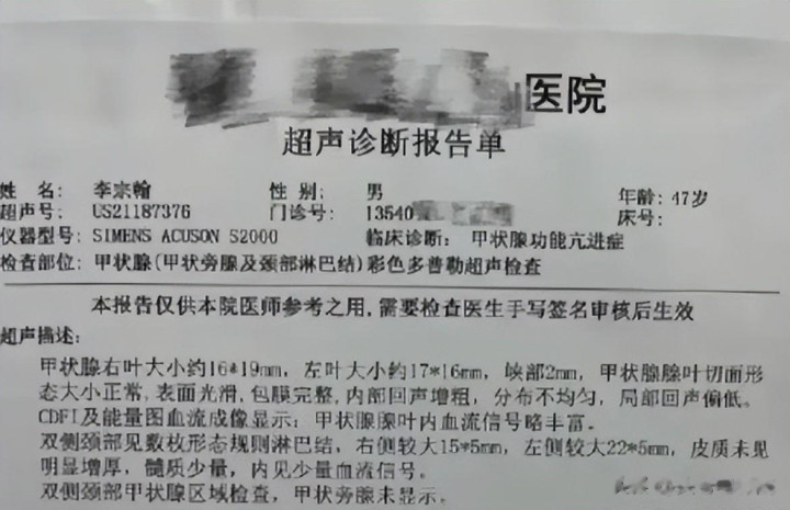 对此,当时李宗翰方面晒出检查报告,解释面部变化源于甲状腺功能亢进。医学专家证实,甲亢确实会导致患者面部消瘦、眼睛突出、皮肤状态改变。