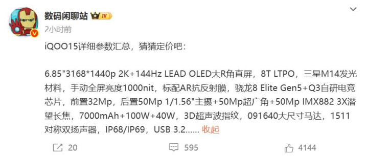 iqoo 15的详细配置都已经爆料的差不多了,搭载骁龙8 Elite Gen 5处理器,配备LPDDR5X+UFS4.1规格,有电竞独显芯片Q3,性能方面还会有强劲优化,依然是电竞感很强的高端手机。